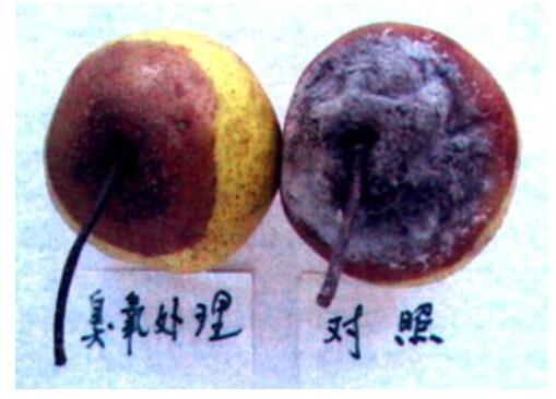 常溫下臭氧處理(左)和對(duì)照(右)的雪花梨的腐爛程度比較上圖顯示的是臭氧處理的雪花梨和對(duì)照果腐爛程度的比較,在上表中的腐爛果統(tǒng)計(jì)中它們肯定均屬于腐爛果,但是就其腐爛程度而言,兩者是有明顯區(qū)別的,經(jīng)臭氧處理的雪花梨,其腐爛病斑的發(fā)展和病原菌絲體及孢子的形成均比對(duì)照果慢。