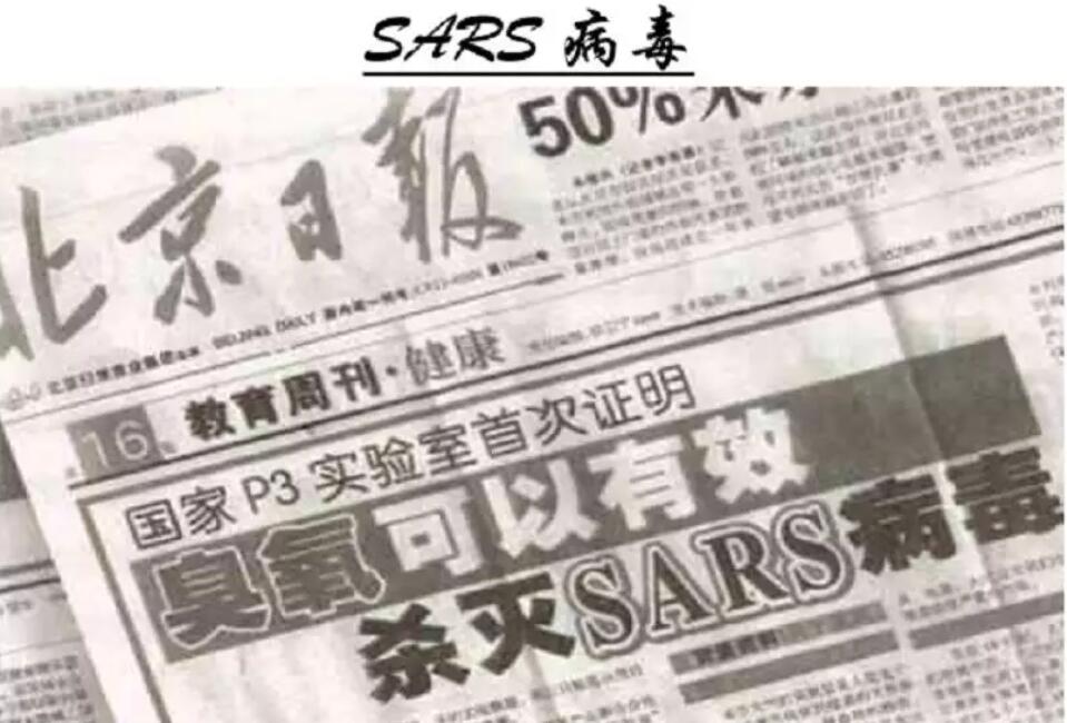 武漢大學(xué)生命科學(xué)學(xué)院的張珈敏,鄭從義等人在“中國(guó)消毒學(xué)雜志”2004年01期上發(fā)表的《臭氧水對(duì)SARS病毒的滅活效果觀察》一文中寫(xiě):用臭氧水對(duì)SARS病毒進(jìn)行滅活實(shí)驗(yàn),當(dāng)臭氧含量為27.73mg/L時(shí),作用4min可完全滅活SARS病毒;當(dāng)臭氧含量為17.82mg/L,作用4min和4.86mg/L作用10min,均可使SARS病毒的滅活率達(dá)100%。