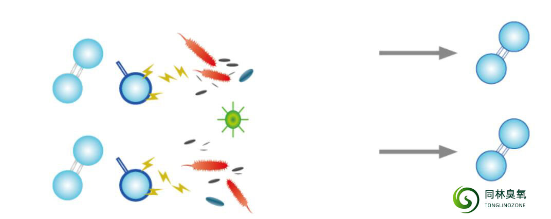 臭氧與有機物接觸后,會釋出弱鍵的氧原子,對有機物進行氧化 臭氧對有機物進行氧化后還原成為氧分子 ( 氧氣)