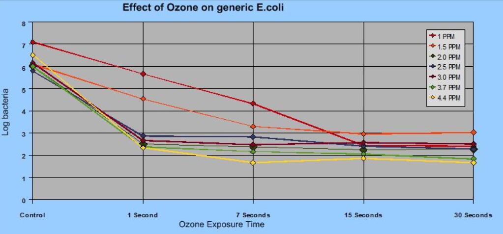 臭氧水平通常為2.0 ppm,用于減少O157:H7大腸桿菌。滅活僅需要臭氧與病原體接觸幾秒鐘的時(shí)間。見下圖。