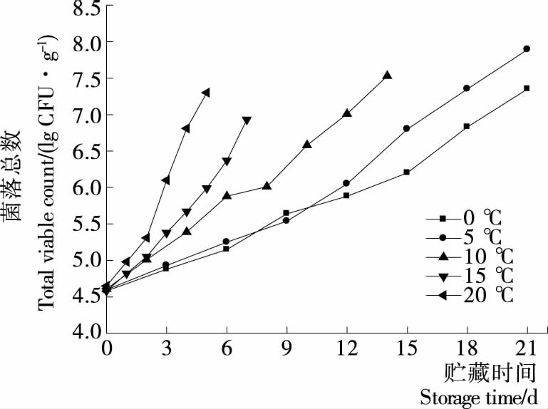 菌落總數能有效反映蔬菜在貯藏過程中的新鮮程度,直接影響到其能否食用,是評定樣品是否腐敗的重要因素。有研究[20]稱蔬菜菌落總數達到6 lg CFU/g時,該蔬菜即到達可食臨界點,當超過該臨界值則表明蔬菜處于腐敗狀態(tài),失去正常食用價值。由圖1可知,在貯藏過程中,各溫度組菌落總數均呈現增長趨勢,可能是鮮切操作對組織結構造成了破壞,使得細胞內汁液流出,為細菌生長提供了營養(yǎng)物質和有利條件[21]。貯藏溫度越低安全食用期越長,如20 ℃樣品在第3天時便達到6.1 lg CFU/g,而0 ℃下菌落總數增速很緩,在貯藏第12天才到達5.88 lg CFU/g,這是因為溫度較低影響到微生物新陳代謝,從而延緩了微生物的生長[22],與王超等[23]使用不同溫度貯藏菠菜得到的結果相同,充分說明低溫能有效延緩細菌的滋生。