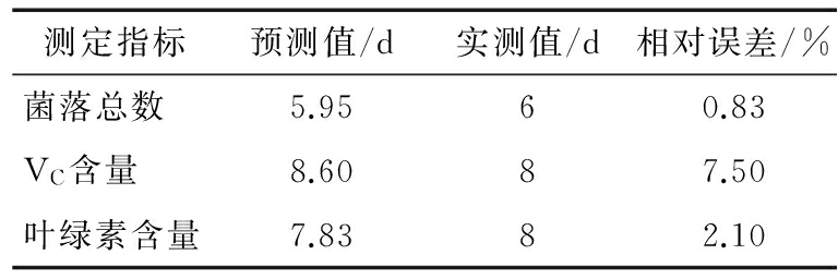 選取樣品在10 ℃條件下的貨架期實測值,驗證預測模型的準確性。由于國標中沒有規(guī)定蔬菜VC及葉綠素含量腐敗標準,因此本試驗采用感官不可接受值所得日期作為VC及葉綠素含量的貨架期終止日期,菌落總數以6 lg CFU/g為可食用標準,樣品菌落總數超過允許范圍即視為貨架期終止,貨架期實測值與預測模型求得的預測值見表2。